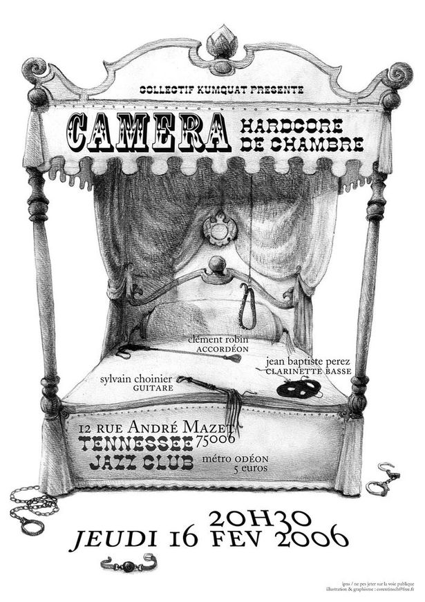 Création de flyer pour les musiciens du groupe "Caméra hardcore de chambre" (S. Choinier, J.B. Perez, C. Robin). Illustration, réalisée au crayon, à la manière du 18e siècle, jouant sur le sens antinomique de musique de chambre et hardcore.